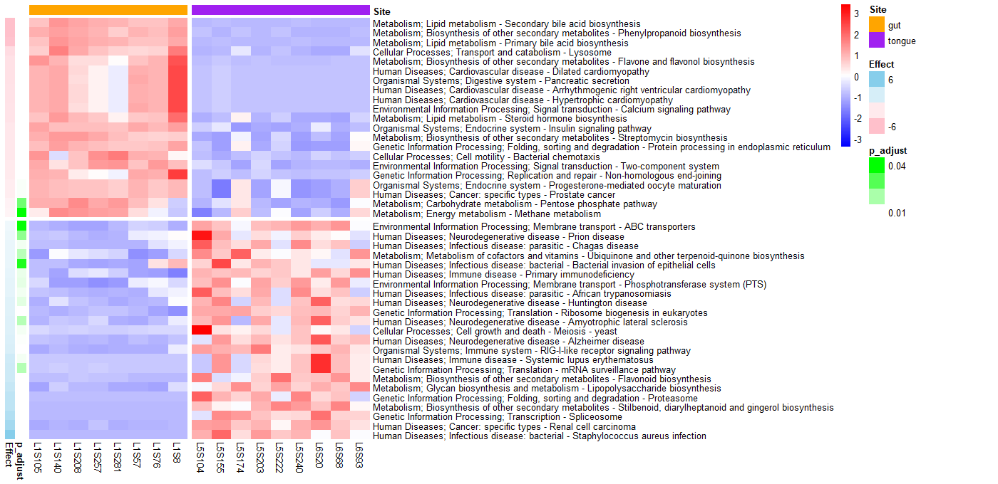 이를 구분하기 위해 heatmap의 annotation 기능을 추가하고, 각 kegg pathway별로 abundance값을 표준화하여서 다시 그려보자.